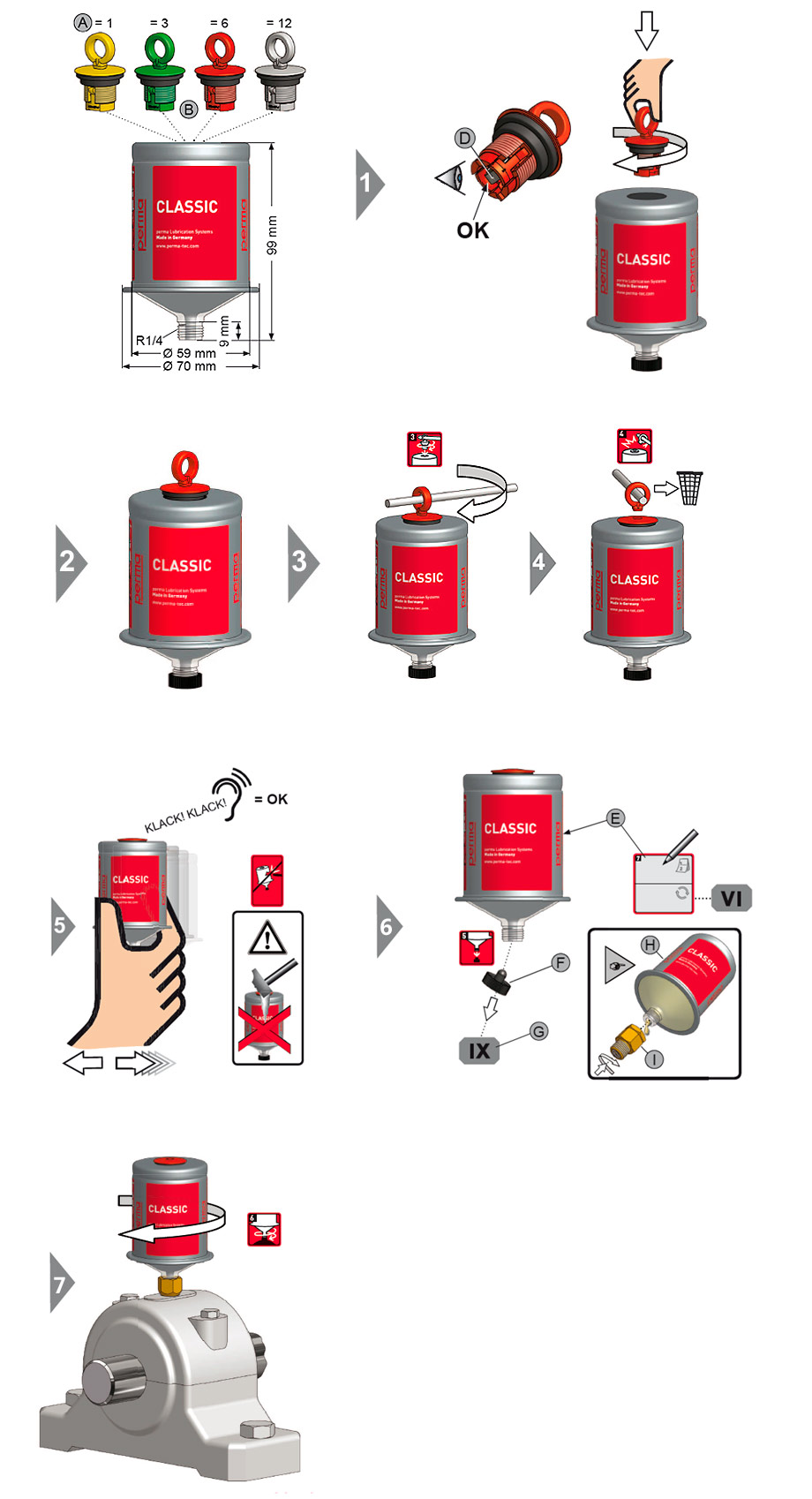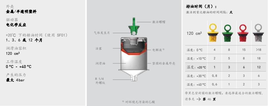 perma CLASSIC 可在 0 °C - +40 °C 的環(huán)境溫度下使用,其基于電化學反應的工作原理 安全可靠。其潤滑周期取決于按顏色編碼的激活螺帽。根據(jù)應用的具體需求,您可以 分別選擇在 1、3、6 或 12 個月內(nèi)排完 120 cm3 潤滑油。由激活螺帽產(chǎn)生的壓力(最 大 4 bar)可推動活塞向前移動,這樣就可以持續(xù)不斷地將潤滑油一點一點地注入潤滑 點。perma CLASSIC 還能完全防塵和防水,并能承受撞擊和意外碰撞。